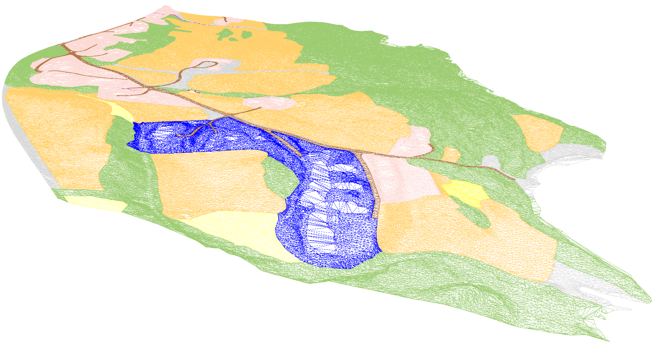 Dette eksempelet viser et triangelnett som er splittet mot AR5 markslagspolygoner.