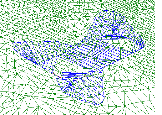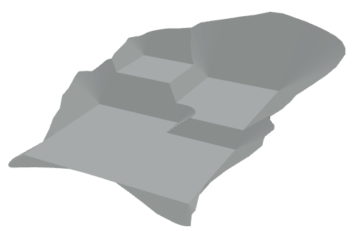 I dette eksempelet har vi tre triangelnett med forskjellig høyde for grunnflaten (markert med rødt polygon), og hvor alle grunnflatene har sideflater som skjærer med terrenget.