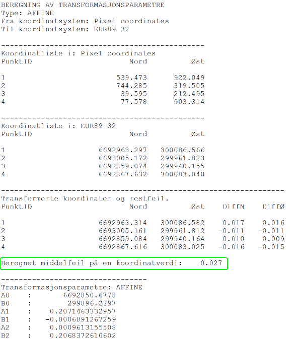 Med knappen Test beregning beregnes affine transformasjonsparametre. Har du flere enn tre punkter, beregnes også standardavvik på en koordinatverdi.
