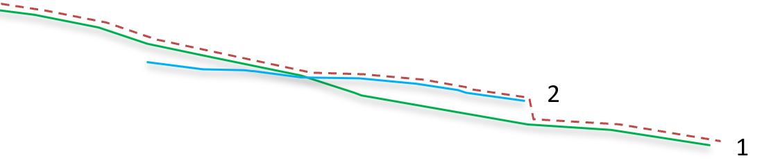 Eksempel hvor fantomlaget TOPP JORD (stiplet rød linje) opprettet fra 1: Jord (grønt) og 2: Jord (blått), med prioritet 1 på laget 2: Jord