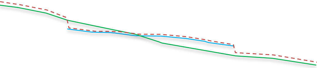Eksempel hvor fantomlaget TOPP JORD (stiplet rød linje) er opprettet fra Lag 1: Jord (grønt) og Lag 2: Jord (blått) med standard prioritet på begge lagene