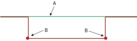 Veger, kryss og groper vil gjøre et inngrep i gridet dersom Utfør inngrep er avhuket under Tegningsinnstillinger. Da vil alle høydene i gridet bli justert til å falle sammen med inngrepet.