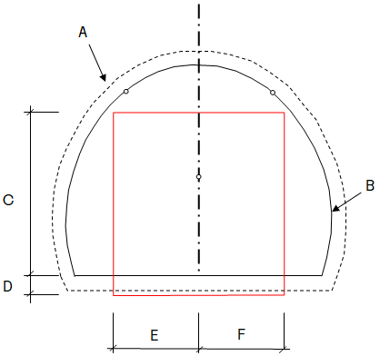 A* = Teoretisk sprengningsprofil, B = Normalprofil, C = Maks. høyde, D = Min. høyde, E = Venstre offset, F* = Høyre offset