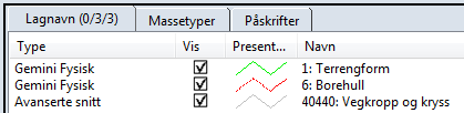 På verktøylinjen, velg Innstillinger Gemini Terrain..., og deretter Vegkropp: Farger og teksthøyder for vegkropp under Prosjektpresentasjon.