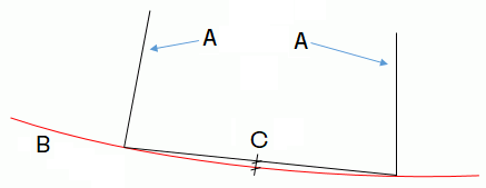 Figuren viser: A = Terrengoverflate, B = Vertikalkurvatur C = Tverrprofil (loddrett og tiltet)