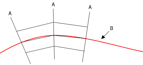 I eksempelet er Maks. sirkelavvik = 0. A = Tverrprofiler, B = Senterlinje