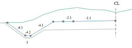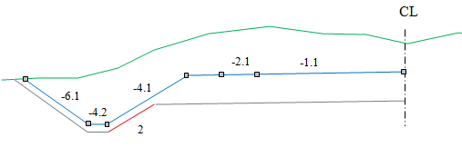 Lagene i overbygningen starter i senterlinjen. Du trenger ikke å angi dybdene; disse blir automatisk beregnet basert på tykkelsene gitt i overbygningstabellen.