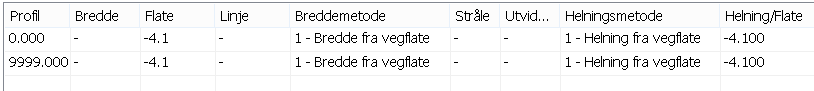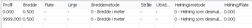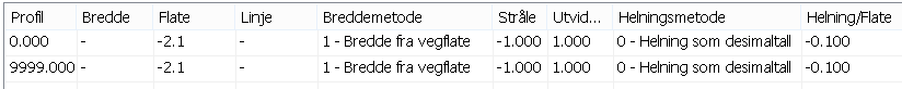 Flatene i spesiell planering er beskrevet med bredde (m) og helning (desimaltall). Flatebeskrivelsen refererer til profilnummer, og hvis bredde og/eller helning er endret mellom to rader, vil programmet interpolere verdier lineært. Merk at du har flere metoder for å angi bredde og helning.