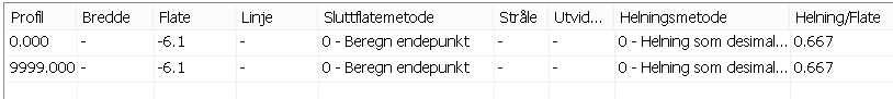 Med metoden Beregn helning gir du inn en vegflate. Helningen beregnes slik at endepunktet i vegflaten blir endepunktet i sluttflaten. Verdien for vegflaten legger du inn i kolonnen Flate.