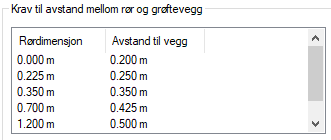 Minimumsavstandene til grøftevegg avhenger av rørdimensjon. Du kan selv sette opp eller endre kravene i tabellen og eventuelt lagre disse i egne maler for senere bruk.