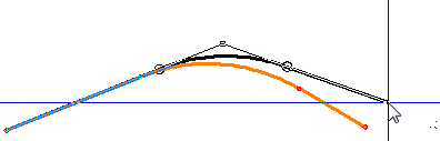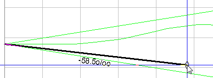I SFI-modell kan du ha valgt en dimensjoneringsklasse for vegen. Da vil maksimal stigning for vertikalkurvaturen være definert. Hjelpelinjer tegnes automatisk for å vise området du må holde deg innenfor for å tilfredsstille maksimal stigning i lengdeprofilet. Går du utenfor dette området, tegnes den dynamiske linjen med rødt.