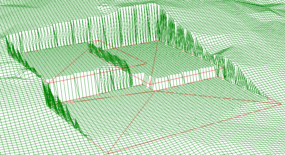 Ved for eksempel inngrepstype skjæring vil triangelnettet justere terrenggridet til laveste nivå.