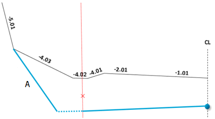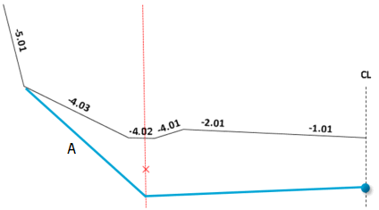 The surfaces in special grading are described with width (m) and slope (decimal number). The surface description refers to the profile number, and if width and/or slope is changed between two rows, the program will interpolate values linearly. Note that you have several methods for specifying width and slope.
