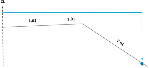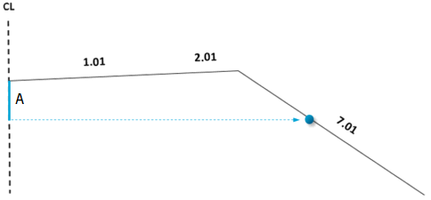 With the Calculate starting point method, you enter the slope and road surface. Based on these values, the starting point for the end surface is calculated. At the same time, the width of the inner surface is adjusted to this starting point. You enter the value for the road surface in the Surface column and the value for the slope in the Slope/Surface column.