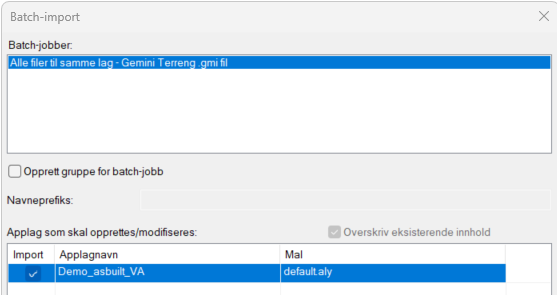 For standard GMI import and GMI import for surveying, it is not possible to import without overwriting existing content in the file. The field is therefore gray and cannot be changed.