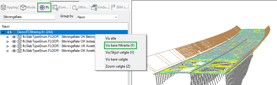 The filtering is only dynamic in the list. We must, for example, select Show only filtered from the context menu when we want to show the result in 2D or 3D presentation.