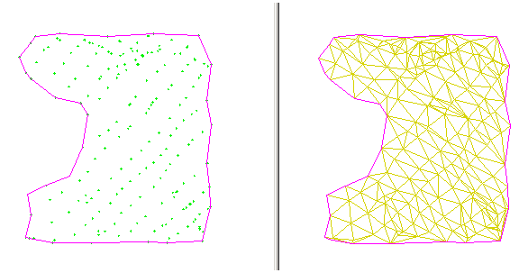 The illustration shows an example with many points, without breaklines and boundary contour, and the result from the triangulation