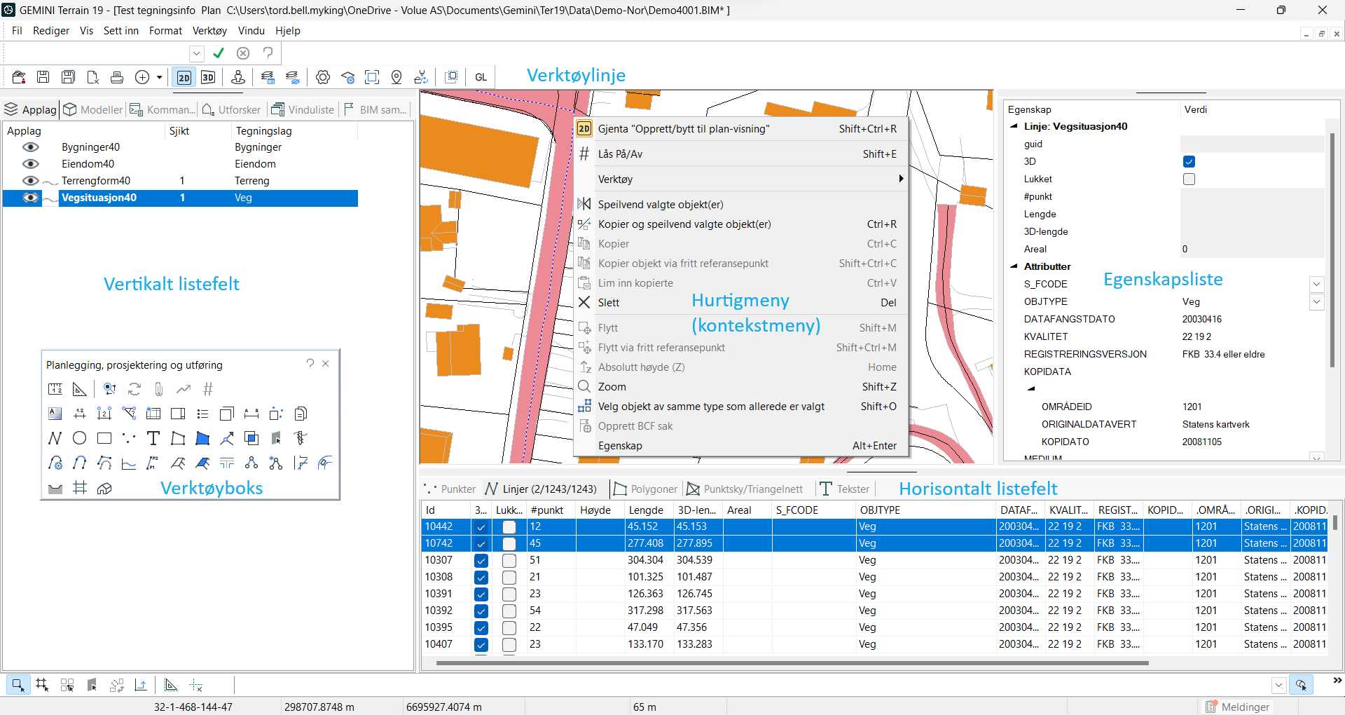 Shows all commands that are inserted in the drawing. This will typically be general objects such as texts and figures or projected objects such as roads and excavations. -