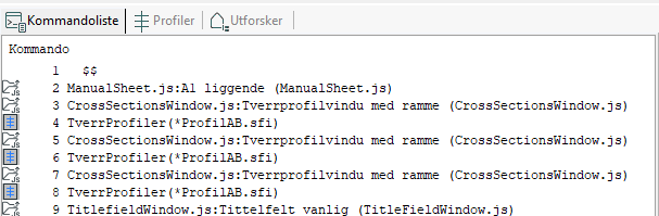 Du kan endre på innsatte kommandoer ved behov, eksempelvis klikke på rammen og flytte plassholderen for tverrprofil. De innsatte kommandoene finner du også igjen i kommandolisten.
