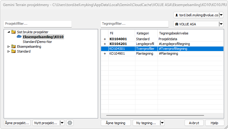 Dette åpner tegningen med innsatt standard tverrprofilark.