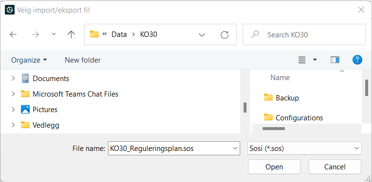 Merk filen KO30_Reguleringsplan.sos og trykk Åpne.