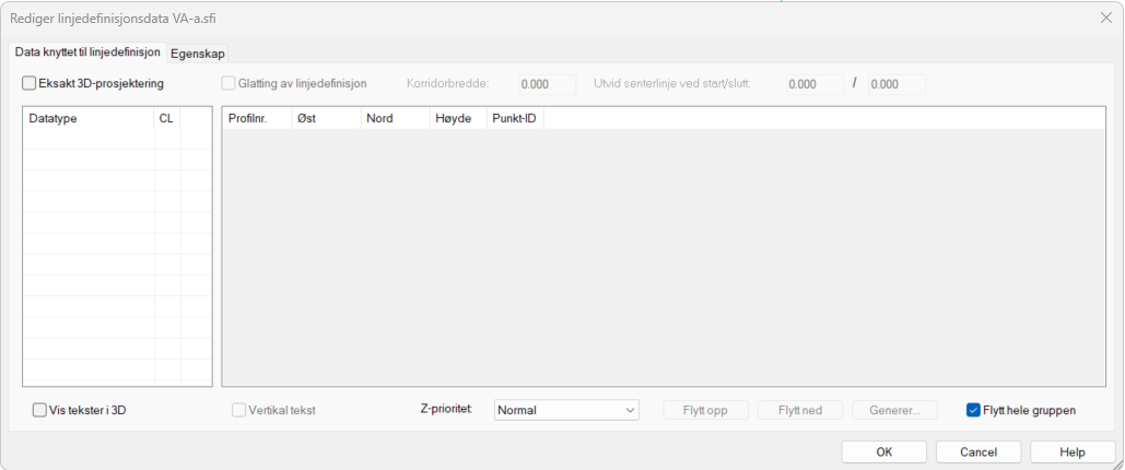 Nå skal du legge inn data for spillvann og vann. Dobbeltklikk på linjedefinisjonsdataene i lengdeprofilet dersom egenskapsdialogen ikke er åpen.