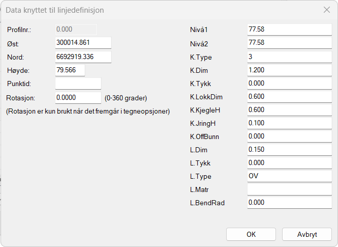Dobbeltklikk på VA-dataene i lengdeprofilet og samme redigeringsdialog som du hadde i plantegningen åpnes.