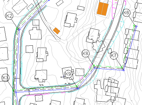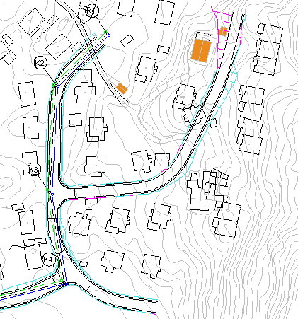 I oppgave 4.8 skal du prosjektere en ledningstrase med VA-data med enkel metode. Forskjellen mellom enkel og eksakt metode, er at eksakt metode har et systempunkt for hver kum / knekkpunkt. Med enkel metode har alle kummene i en kumgruppe samme systempunkt, og du bruker presentasjonspunkt for å skille datatypene visuelt.