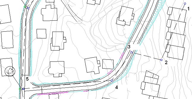 Du skal legge inn fem kummer/trasepunkter i vegen som vist i figuren. Punkt 5 skal du snappe til K3 i den prosjekterte ledningen KO40-va-b.sfi.