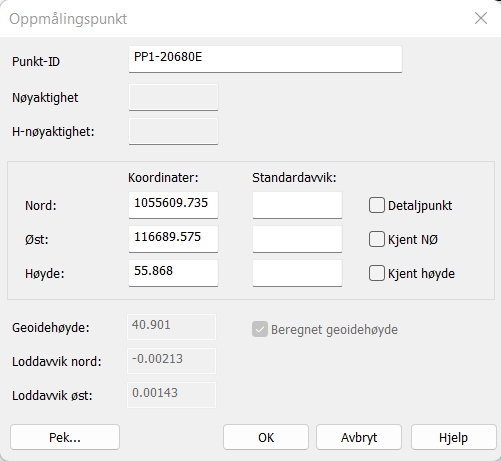 Punktstatus endres til Kjentpunkt og nøyaktighet skrives til koordinatene