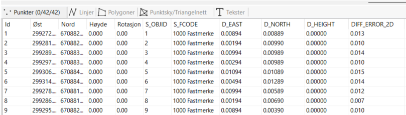 Merk alle punktene i punktlisten og velg Punktdifferanse... på menyen Geometrisk kontroll.