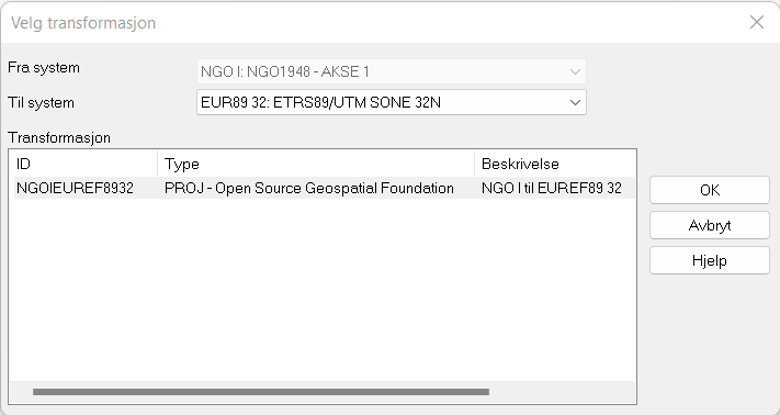 - Fra NGO akse I til EUREF89 sone 32 med transformasjon fra Kartverket.