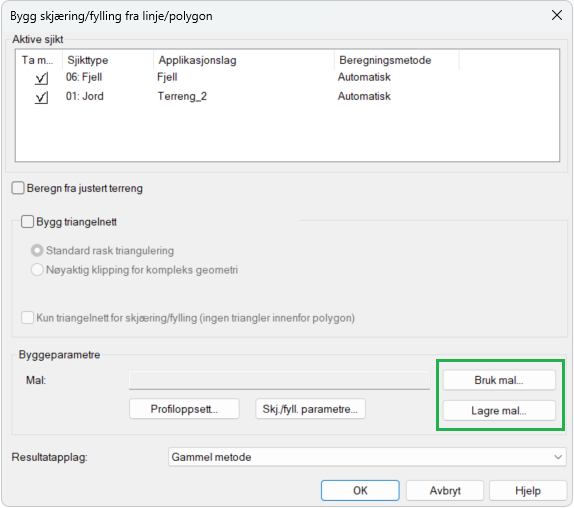 Vi kan lagre byggeparametrene, Profiloppsett... og Skj./fyll.-parametre..., til en mal med knappen Lagre mal....