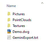 Funktionen stöder också export av punktmoln. Varje punktmolnobjekt i Gemini exporteras som RCS-filer och läggs på undermappen Pointclouds.