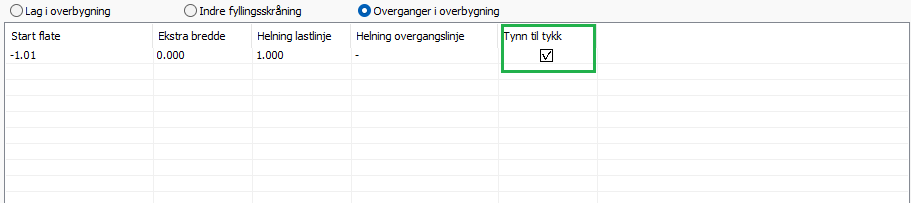 I tabellen för övergångar lägger vi in värde för Lutning lastlinje och kryssar i för Tunn till tjock.