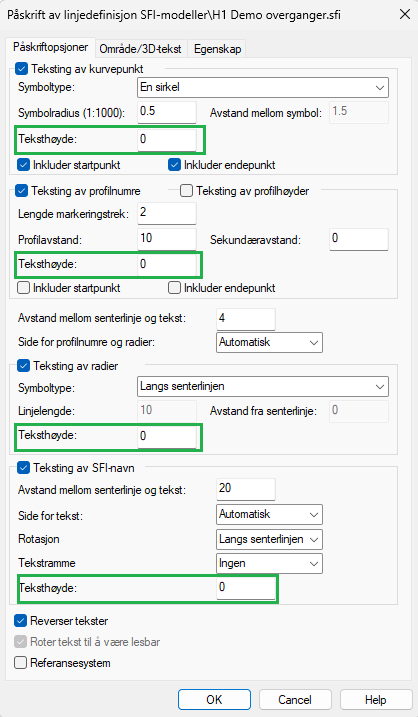 Texthöjder för kurvpunkt, profilnummer, radius och SFI-namn kan vi sätta för den enskilda SFI-modellen direkt i dialogen.