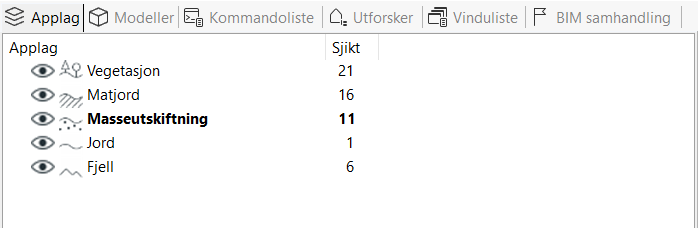 Metodene får vi tilgang til hvis vi definerer et sjikt for applikasjonslaget. Vi kan ha mange ulike sjikt i en tegning, typisk når vi har flere lag i grunnen som jord og fjell. I det vertikale listefeltet får vi et illustrerende ikon for hvert applikasjonslag som definerer et sjikt.