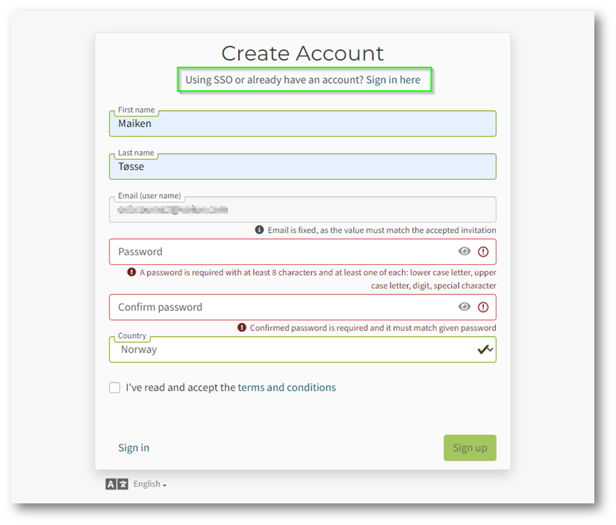 Når du aksepterer invitasjonen, kan du velge å logge inn med eksisterende konto (SSO) eller opprette en ny konto (brukernavn og passord). Vi anbefaler alle med Microsoft Office 365 å bruke Single Sign On (SSO), slik at du kan bruke samme brukernavn og passord på tvers av applikasjoner. Trykk på Sign in here øverst for å velge dette.