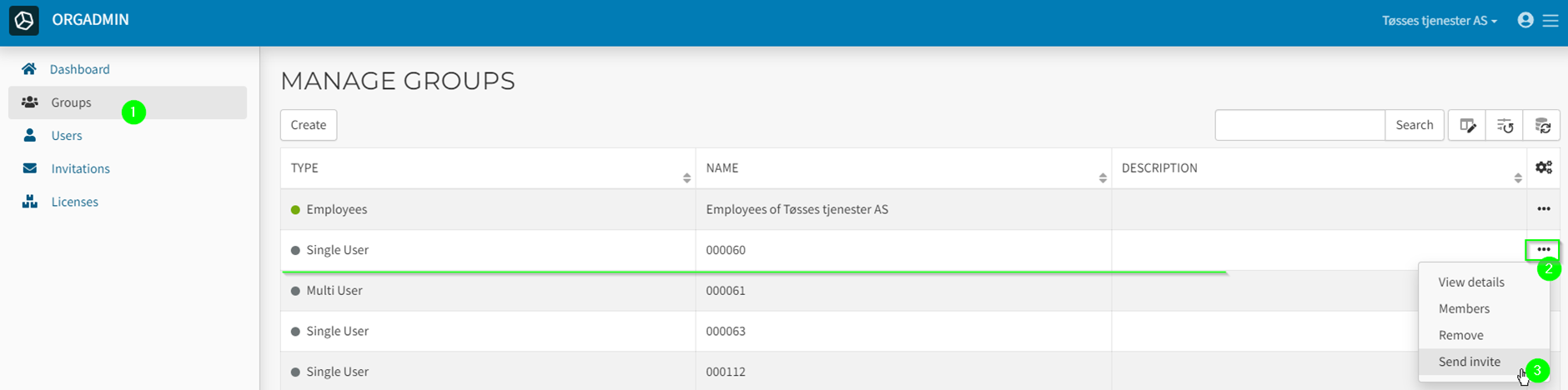 Sluttbrukere kan inviteres direkte til riktig gruppe (lisens) i tillegg til Employees-gruppen. Alternativt kan sluttbrukere legges til i gruppen (lisensen) i ettertid. Se mer under Groups.