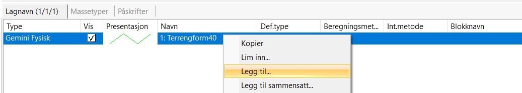 Du kan også opprette nye fysiske lag når du er i lengde- og tverrprofilredigering. Valget Legg til/Opprett... finner du i det horisontale listefeltet for lagnavn.