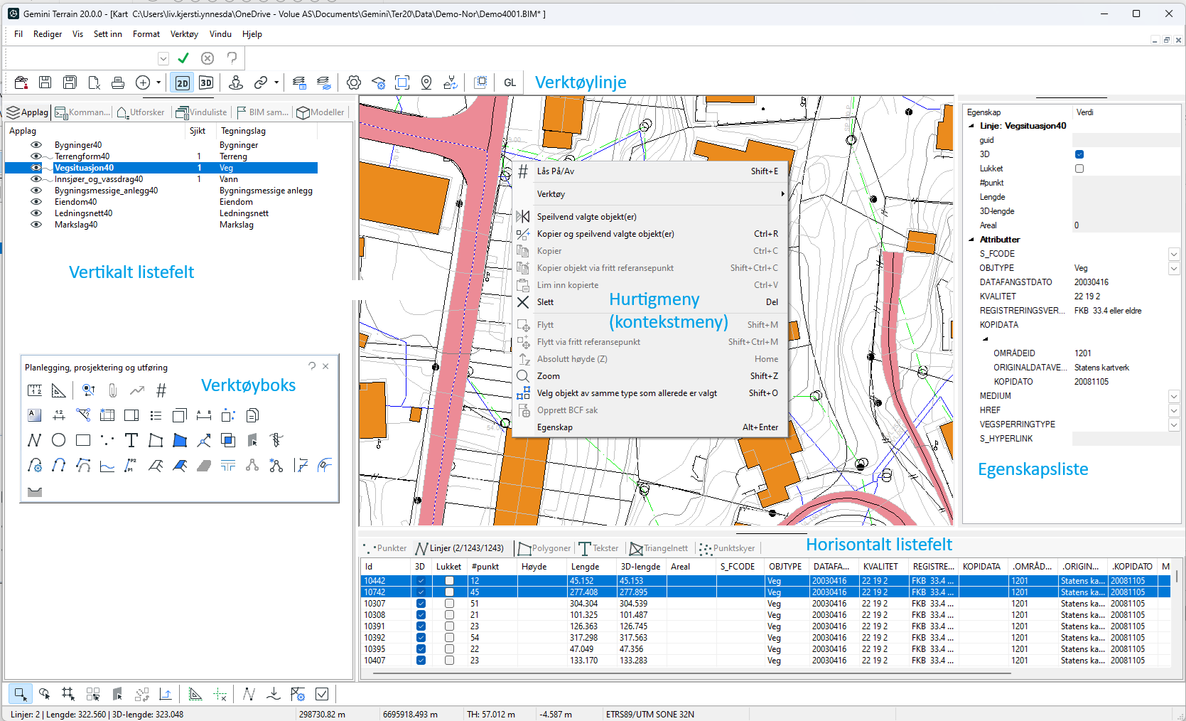 Objektene i det horisontale listefeltet har kolonner for faste egenskaper (beregnet fra deres geometri) og andre skjemadefinerte egenskaper (metadata).