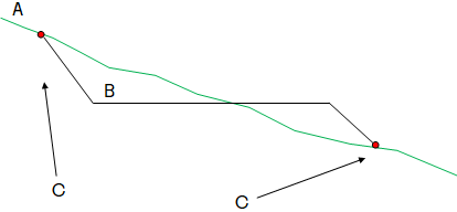 Figurtekst: A = Lag 1, B = Lag 2, C = Beregnede skjærings- og fyllingslinjer