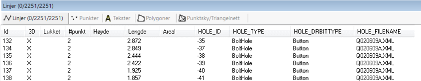 Vi kan importere IREDES borlogger til applikasjonslag. Alle borhull med egenskaper kommer med. Hvert borhull blir en linje med start- og sluttpunkt.
