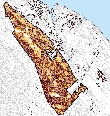 For å kunne utføre analysene må vi ha en terrengmodell i tegningen, det vil si et applikasjonslag som er definert som et sjikt. Vi kan kjøre analysen for hele terrengmodellområdet eller avgrense området for analysen med et polygon.