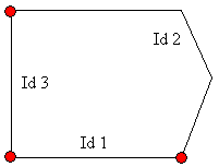 I dette eksempelet har vi tre linjer, id 1, id 2 og id 3. Videre har vi et polygon, id 1. Linje 2 følger ikke polygonobjektet. Et slikt tilfelle kan lett oppstå hvis vi redigerer linje 2 uten å polygonisere på nytt. I dette tilfellet er det satt inn et ekstra punkt i linje 2.