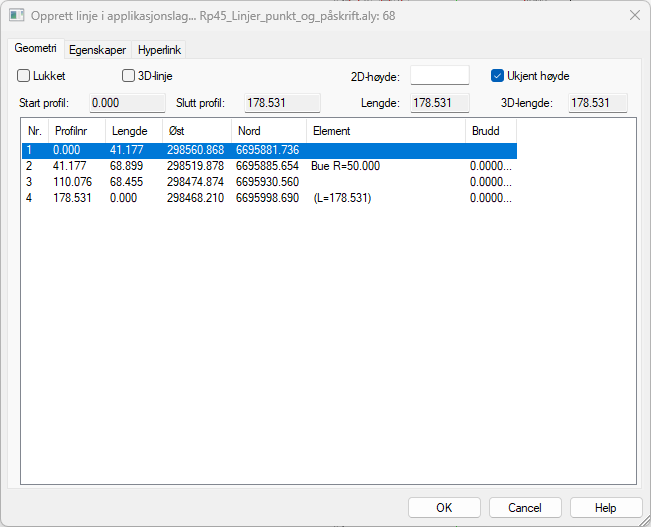 Etter at senterlinjen er konstruert må denne kontrolleres. I dialogen for linjegeometri har vi en egen kolonne for brudd. En eventuell verdi i denne kolonnen angir vinkeldifferansen mellom elementene. En matematisk korrekt senterlinje vil ikke ha brudd. Sjekk derfor at brudd ikke forekommer i linjen.