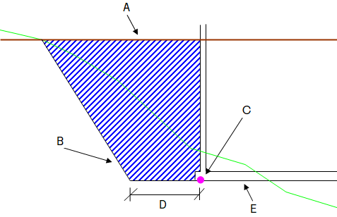 Figurtekst: A = Fremtidig terreng, B = Sideflater, C = Begrensningskontur, D = Bredde, E = Hovedflater